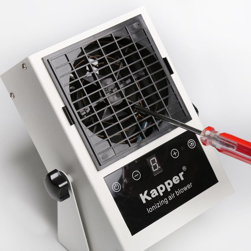 KP101B第5代智能型臺(tái)式離子風(fēng)機(jī)可產(chǎn)生大量的帶有正負(fù)電荷的氣流,可以將物體上所帶的電荷中和掉。當(dāng)物體表面所帶為負(fù)電荷,它會(huì)吸引氣流中的正電荷,當(dāng)物體表面所帶為正電荷時(shí),它會(huì)吸引氣流中的負(fù)電荷,從而使物體表面上的靜電被中和,達(dá)到消除靜電的目的。